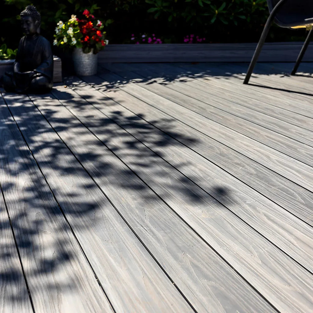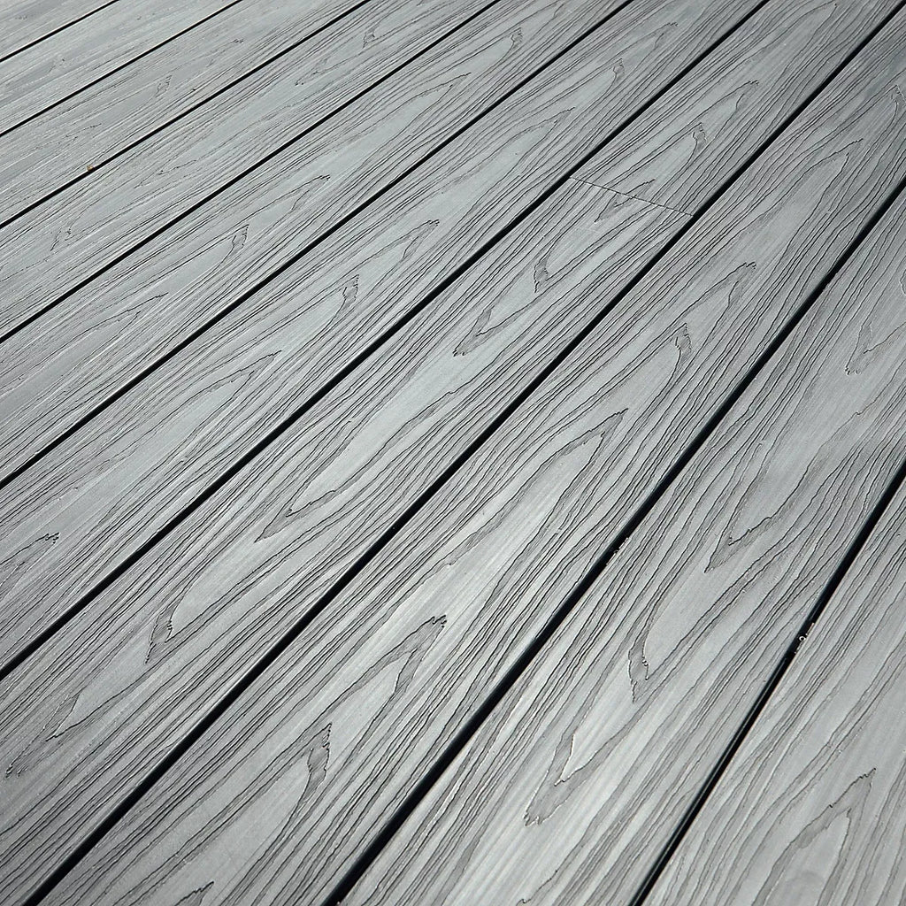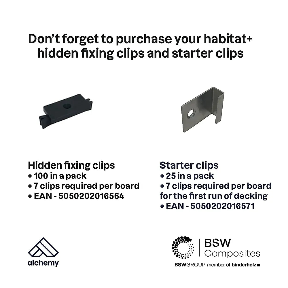 Grey Composite Decking Board, Habitat+ is reversible, one side has a woodgrain effect the other has a grooved finish. Use only the recommended Habitat fixings for installation (starter clips, hidden fixings and screws).